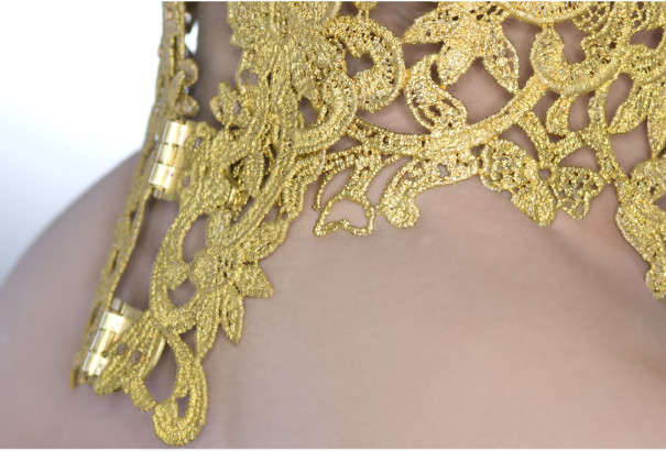Metal lace collar, rear view of hinged mechanism on a female in profile on a white background.
